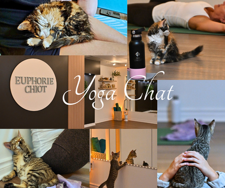 Invités par Euphorie Chiot, nous avons été chaleureusement accueillis dans leur magnifique studio de yoga à Sainte-Thérèse pour trois séances mémorables, où se mêlaient zénitude, ronrons et fous rires.